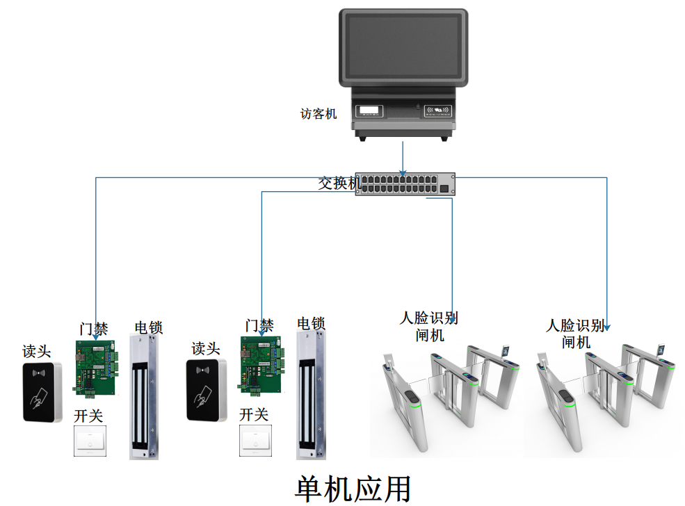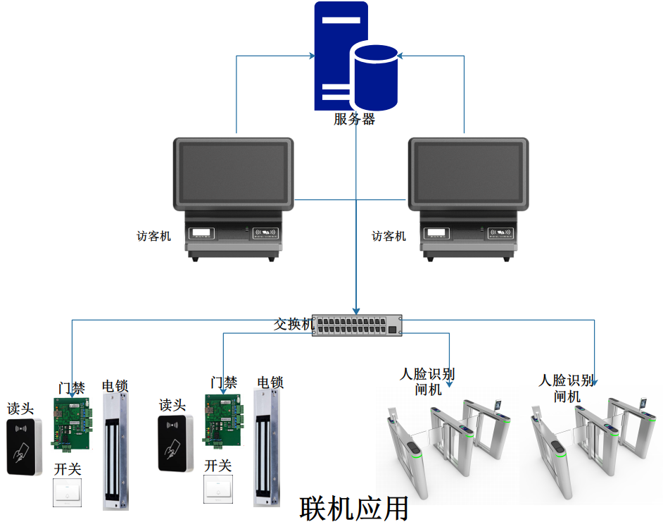 三、典型应用 》访客机依靠本地服务结合人脸门禁/验证机以及通道闸/门锁的单机应用 》多台访客机连接服务器结合人脸门禁/验证机以及通道闸/门锁的多机协同应用同应用