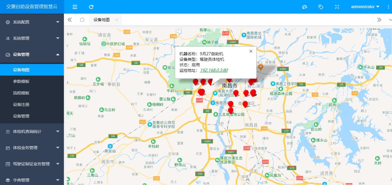 交警自助设备管理智慧云平台主要实现设备网点管理、设备模板动态配置、流程信息一键应用、体检信息在线审核、医院信息管理、体检退费处理等功能,帮助医生进行体检业务缴费信息查询、体检在线审核、制证信息查询统计,及时充分地了解各网点体检业务的办理情况。除此之外还可通过云平台查看各地接入的设备,对设备的状态和现场进行远程监控。