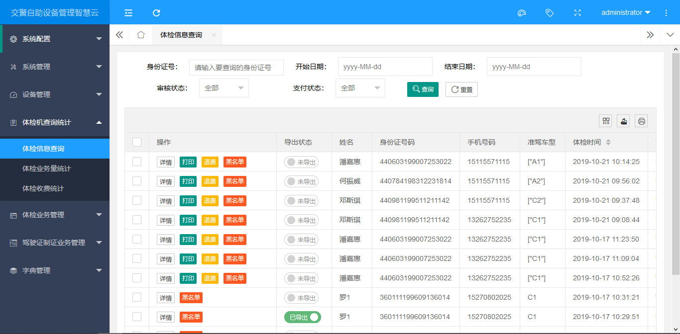 3)程序自动上传:此种方式不需要申请互联网体检接口,自助体检设备将体检数据汇集到服务器,医生通过体检后台并审核通过的体检结果,后台程序自动将通过的体检数据填充到上传到交通安全综合服务管理平台。由于全国各地数据上传方式有所差异,全国部分地区不仅申请公安专网、六合一互联网体检的接口难度大,而且甚至大部分没有体检的互联网接口,这样造成自助体检设备推广难度巨大。通过调研整合信息,虽然部分地区我们申请交管六合一 接口难度大、甚至申请不到接口,但是我们可通过直接与医院合作, 把自助体检设备采集并经过医院审核通过的体检信息,人工的通过医 院体检数据上传平台将数据上传到公安交管对应的数据平台。所以通过无接口的人工上传或者程序自动填充数据方式可以实现绕过接口,这样即可解决公安交管接口难以申请的问题,为大家提供更加便捷的通道。