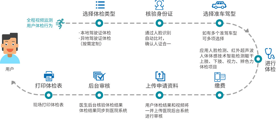 “医院远程驾驶员智慧体检机”按照国家规定,符合医院要求,可实现驾驶人自助体检,整个体检流程符合《机动车驾驶证申领和使用规定》(公安部第139号令)的体检标准要求。