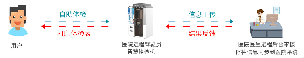 驾驶员在拍照体检一体机体检完成后,体检信息通过互联网数据传输到医院审核后台,后台医院医生审核体检信息无误并通过后后,群众即可现场打印出驾驶员体检报告单,并且审核通过的驾驶员体检信息通过数据平台上传至交管六合一系统中。