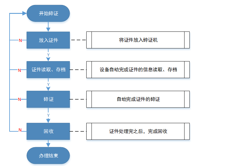 证件放入碎证机后,通过触摸屏运行客户端程序,设备自动将证件传送到身份证信息读取模块、自动完成信息读取、存档;并自动完成碎证处理,实现证件无效,处理完毕后,失效证件自动到回收箱。
